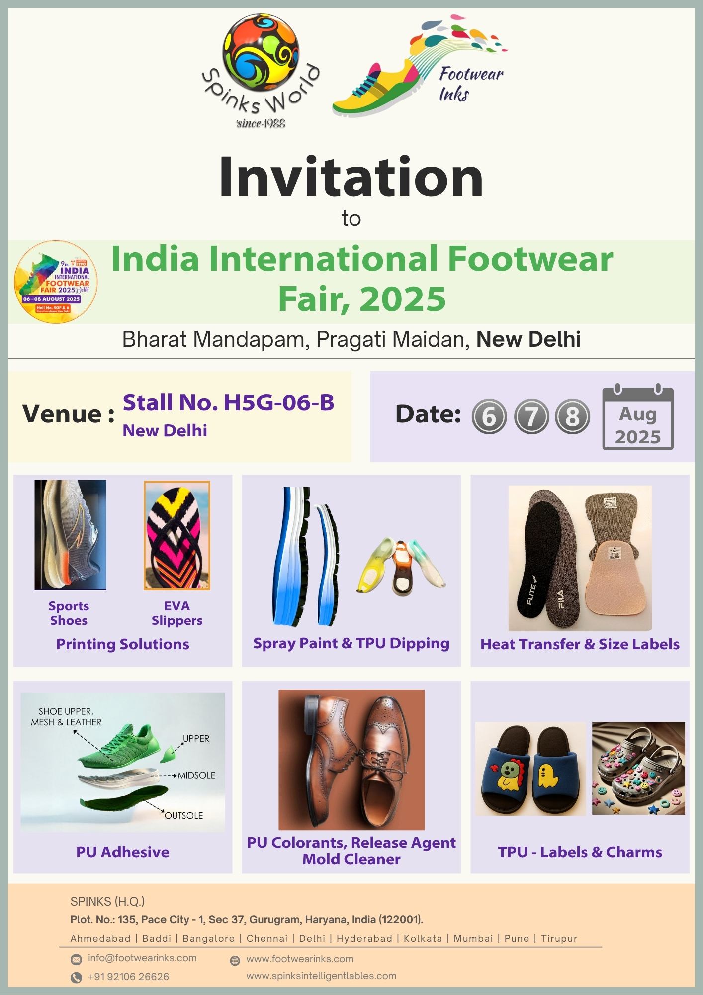We are pleased to inform you that we will be participating in the Indian International Footwear Fair (IIFF) 2025. Spinks World warmly invites you to visit our stall at the event, which will be held from 6th to 8th, August,   2025 at Pragati Maidan, New Delhi, India. We would be delighted to have your presence at the event.