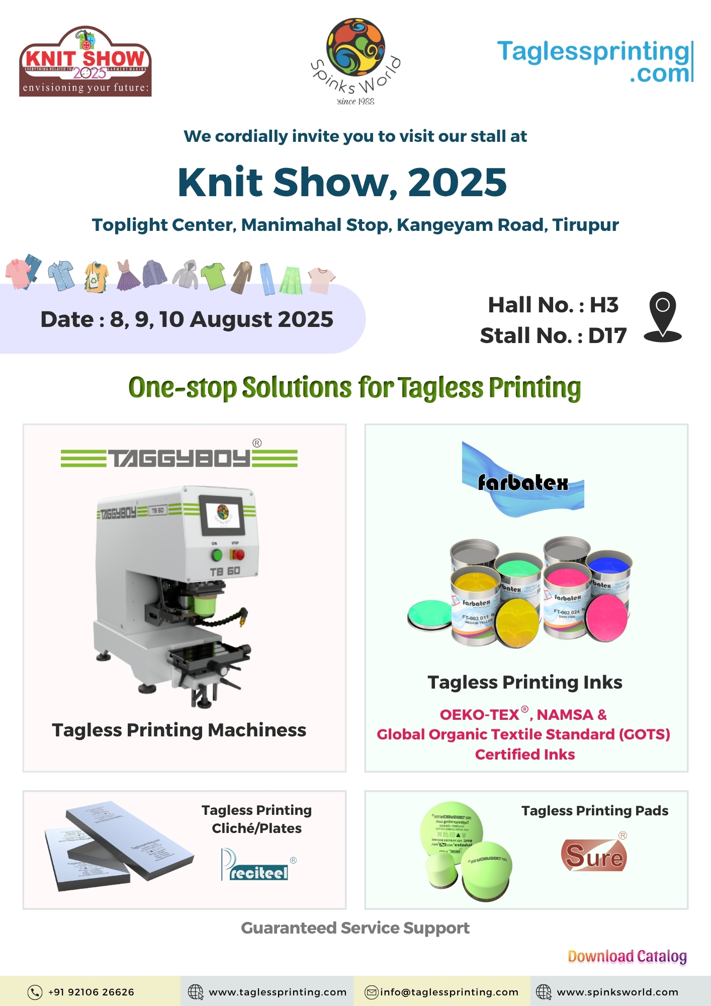 We are pleased to inform you that we will be participating in the Knit Pro Exhibition 2025. Spinks World warmly invites you to visit our stall at the event, which will be held from 8th to 10th August 2025 in Tirupur, India. We would be delighted to have your presence at the event.