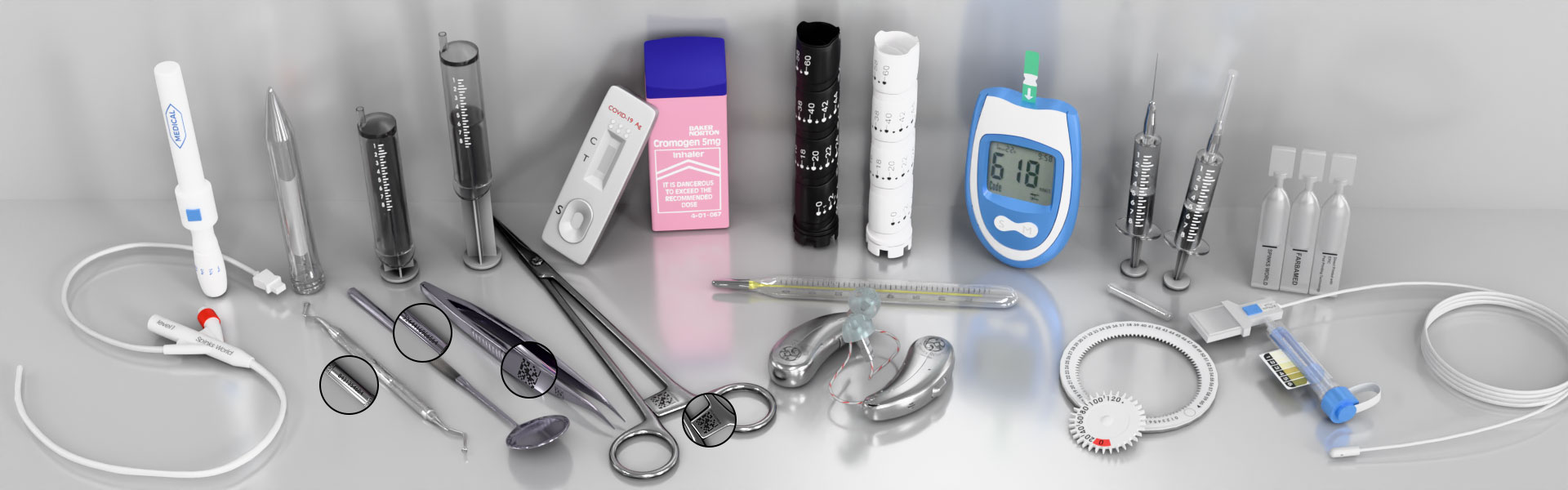 We offer printing solutions for a wide range of medical products, including catheters, thermometers, syringes, face masks, glucose meters, first aid kits, scalpels, curettes, pharmaceutical glass containers, medicine strips, and lab wares like beakers, pipettes, conical flasks, petri plates, test tubes, measuring cylinders, stents, implants, centrifuge tubes, vials, Eppendorf pipettes, shafts, clips, handles, adapters, medical housings, syringe kits, connectors, and many more.